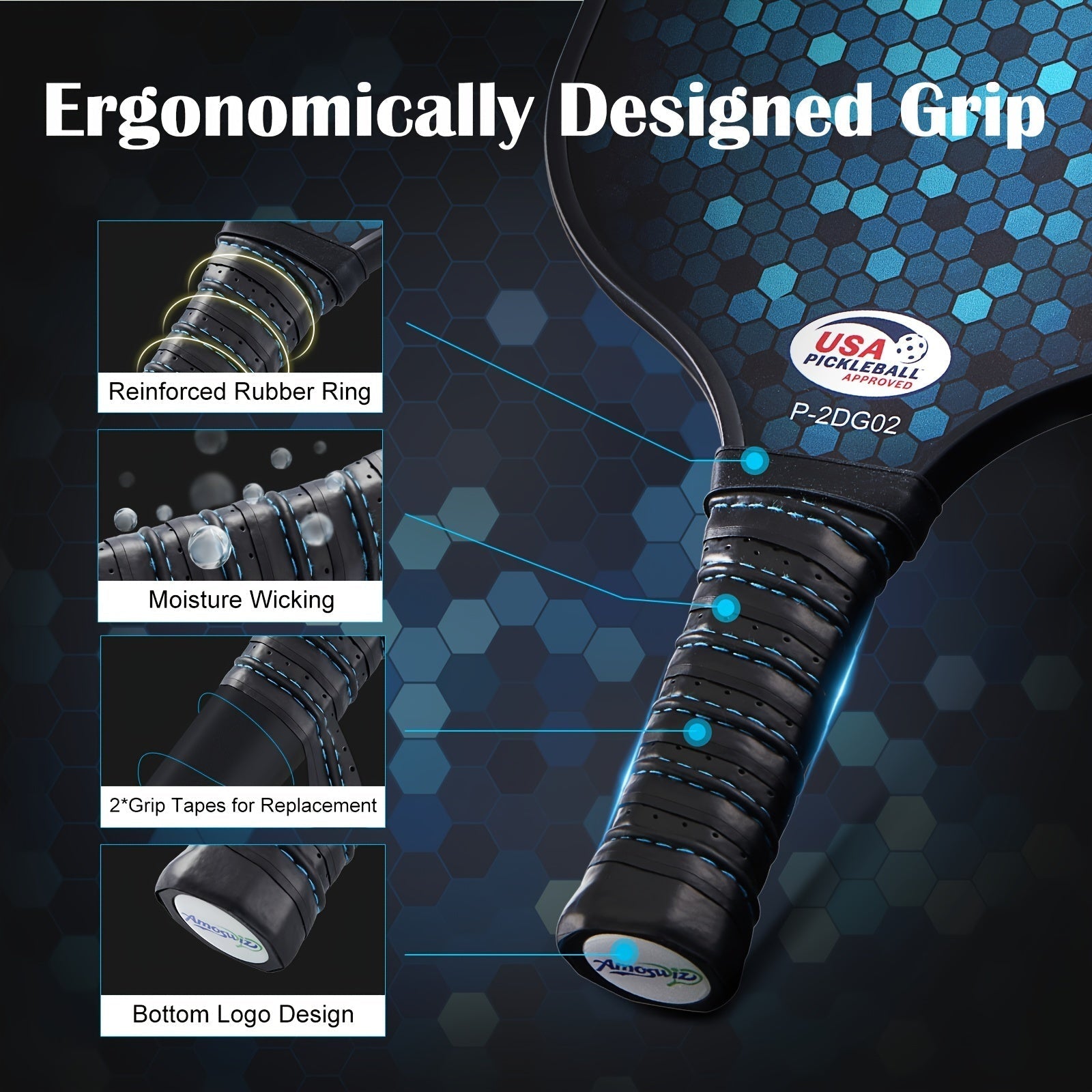 Answer 1: The paddles are designed with a wider body shape for enhanced balance and versatility, allowing players to improve their skills easily. They also feature an ergonomic grip that is perforated and cushioned to absorb sweat, ensuring comfort and control during gameplay.